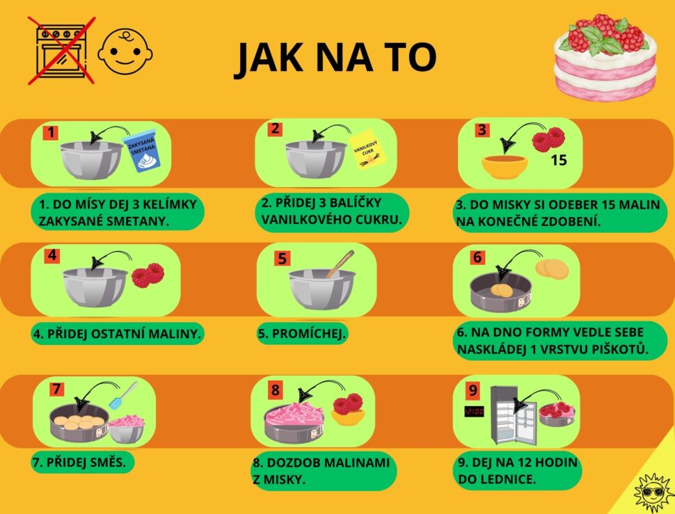 Školní děti zvládnou recept o devíti krocích samy. Je ale dobré si pokyny před přípravou společně přečíst. Tak si budeme jisti, že dítě obrázkům správně rozumí.