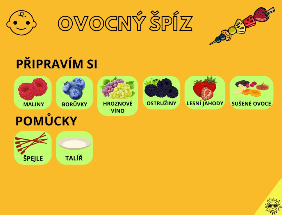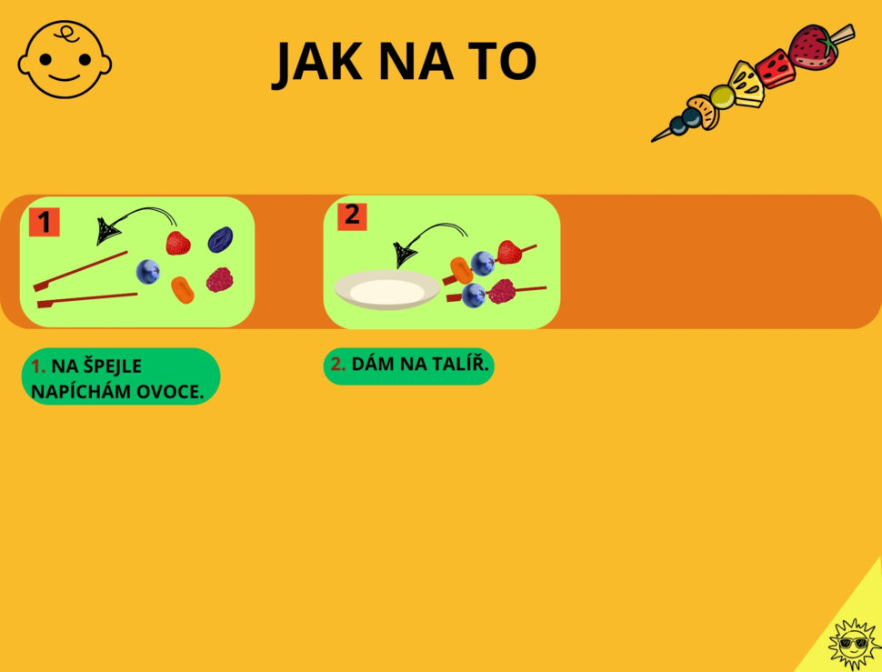Dítě napíchá ovoce na špejli podle své fantazie nebo chuti. Hotové si odkládá na talířek. Je dobré vybrat takové ovoce, které má dítě rádo, aby ho po přípravě rádo a s chutí snědlo 🙂